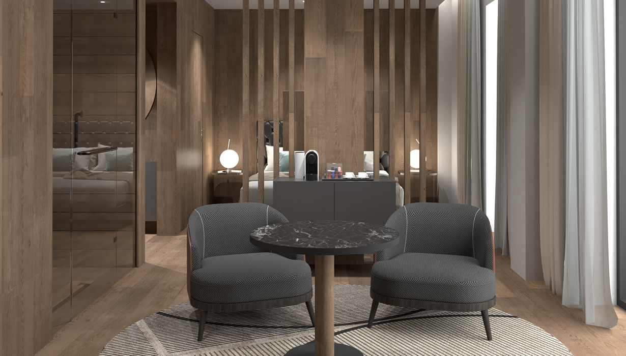 La Deluxe Suite è pensata per chi cerca sintonia tra corpo e paesaggio. Il terrazzo privato panoramico si apre sulla vista sconfinata delle montagne abruzzesi e sull’incantevole borgo di Rivisondoli, regalando panorami mozzafiato da ammirare in ogni stagione. Gli interni, curati nei dettagli, uniscono materiali pregiati, parquet in legno e un’atmosfera sobria e luminosa. Uno spazio dove tutto scorre con naturalezza, tra silenzio, eleganza e comfort autentico.